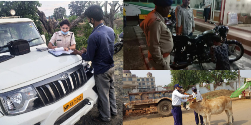 हरदा । पुलिस अधीक्षक हरदा मनीष कुमार अग्रवाल व अतिरिक्त पुलिस अधीक्षक हरदा गजेंद्र सिंह वर्द्धमान के निर्देशानुसार सूबेदार वर्षा गौर एवं एएसआई सोबरन सिंह पटेल व यातायात स्टाफ द्वारा 18 वाहनों पर चालानी कार्यवाही करते हुए 7750 रू. का समन शुल्क वसूला गया जिसमें- बिना हेलमेट वाहन चालकों, तीन सवारी ,बिना सीट बेल्ट, बिना नंबर प्लेट एवं वाहन की बॉडी से ऊंचा माल भरे हुए वाहनों पर चालानी कार्यवाही की गई| व साइलेंसर परिवर्तित कराई गई पटाखे के जैसी ध्वनि उत्पन्न करने वाली एक रॉयल एनफील्ड गाड़ी का साइलेंसर मौके पर बदलवाकर आवाज वाला साइलेंसर जप्त किया गया |साथ ही गायों के गले में रेडियम बांधने एवं ट्रैक्टर ट्रॉली पर रेडियम लगाने की मुहिम को आगे बढ़ाते हुए आज भी गायों के गले में रेडियम की रस्सी बांधी गई एवं ट्रॉलीयों पर रेडियम पट्टी लगाई गई।