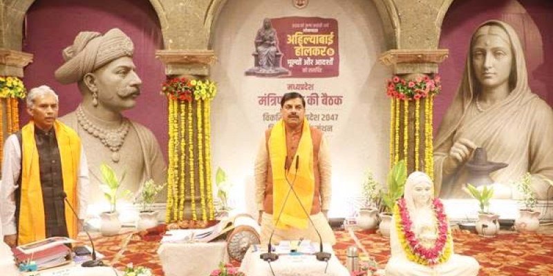 मुख्यमंत्री डॉ. यादव इंदौर के राजवाड़ा के दरबार हाल में मंत्रि-परिषद की बैठक के पहले सदस्यों को संबोधित कर रहे थे। मुख्यमंत्री डॉ. यादव ने कहा कि प्रधानमंत्री श्री नरेन्द्र मोदी के प्रेरणा वाक्य "विरासत से विकास की ओर" से प्रेरणा लेकर विरासत के संरक्षण और संवर्धन करते हुए विकास की अवधारणा को मूर्त रूप दिया जा रहा है। मंत्रि-परिषद की पहली बैठक जनजातीय वीरांगना रानी दुर्गावती की स्मृति में जबलपुर में आयोजित की गई थी। आज लोकमाता अहिल्याबाई को समर्पित मंत्रि-परिषद की बैठक की जा रही है। उन्होंने कहा कि आगामी 3 जून को पचमढ़ी में जनजातीय राजा श्री भभूत सिंह की स्मृति में मंत्रि-परिषद की बैठक का आयोजन किया जाएगा।